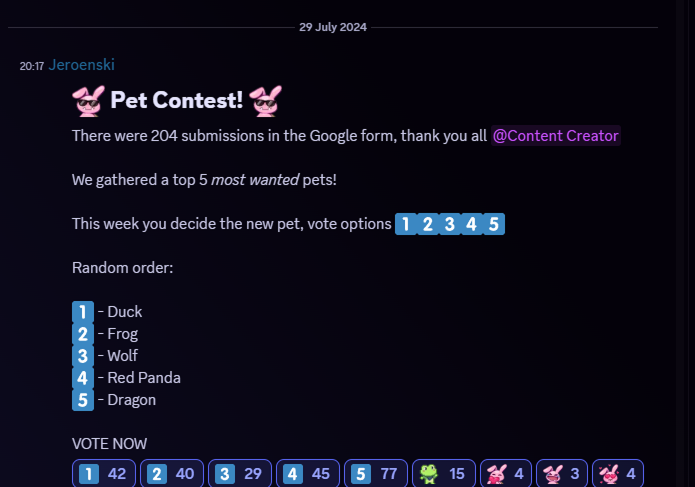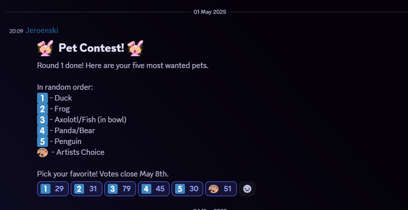 As you may have noticed, frogs, ducks, wolves, and pandas/bears have made a regular appearance. And we are overdue for another contest. So who knows. If you are in our Discord, you will be the first to receive the announcements. So if you have a pet in mind, drop your suggestion, and you might just see it on stream one day.