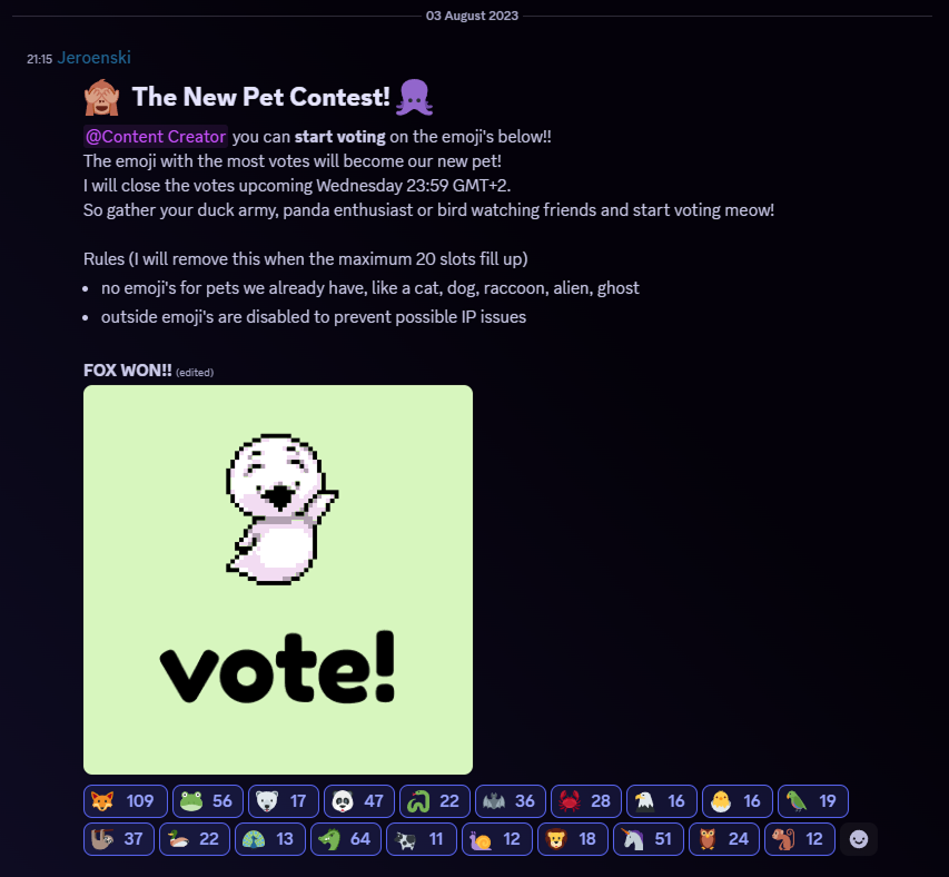 The first pet contest ran through Twitter and Discord. We thought it would grow our social presence, it didn't, but it did give us insights on how to run proper contests. I believe we had around 4 to 5 genuine suggestions, and we let Joris and his wife decide. And that's how a Xenomorph became a pet in Pando.